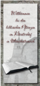 Wir freuen uns, dass wir jetzt im achten Jahr Ihnen hier im Klosterhof eine Auswahl von ca. 30 biblischen Pflanzen präsentieren können. Für jede Pflanze haben wir einen kurzen Bibelspruch gewählt. Wir hoffen, dass wir durch dieses „biblische Pflanzenbeet“ eine kleine Oase der Ruhe und Besinnung für Sie geschaffen haben, dass Sie dadurch angeregt sind weiter in der Bibel zu lesen, und dass unseren biblischen Pflanzen im Klosterhof einen intensiveren Zugang zu den Bibelstellen ermöglicht, oder sogar den Anstoß gibt, selber Bibelpflanzen in den Garten zu setzen.